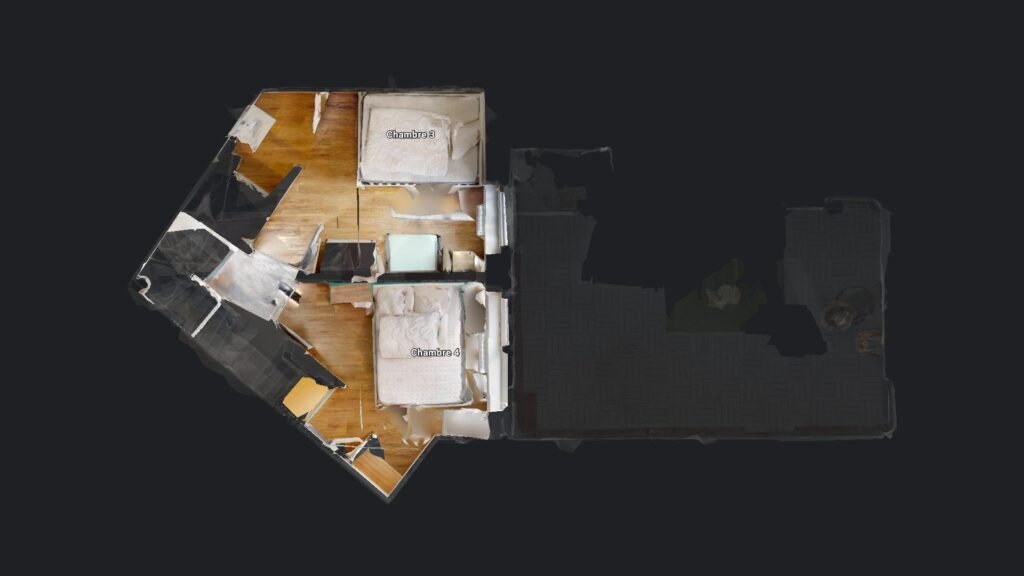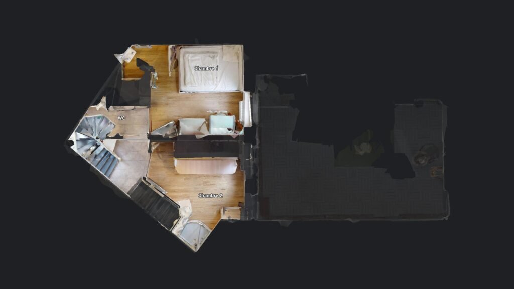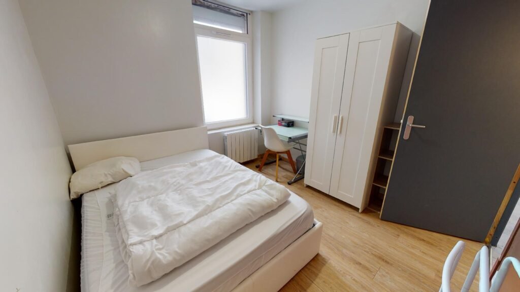 La chambre 1 mesure 11,5m2. Cette chambre est équipée d’un lit double, d’un bureau, d’une chaise et de rangements.