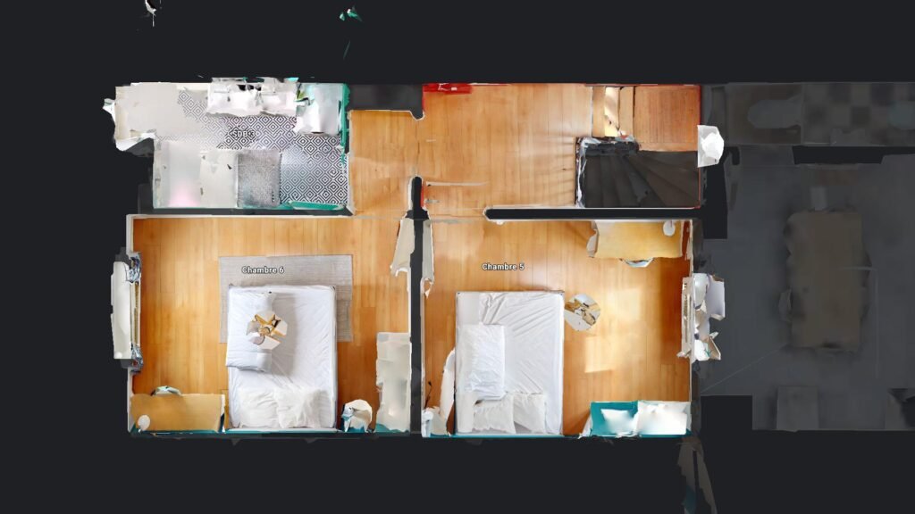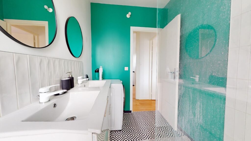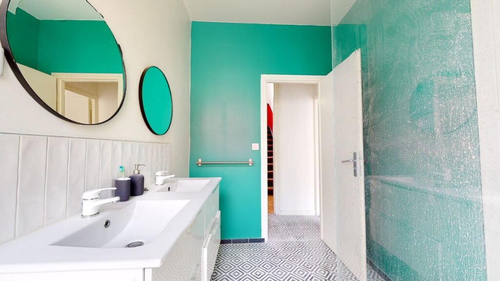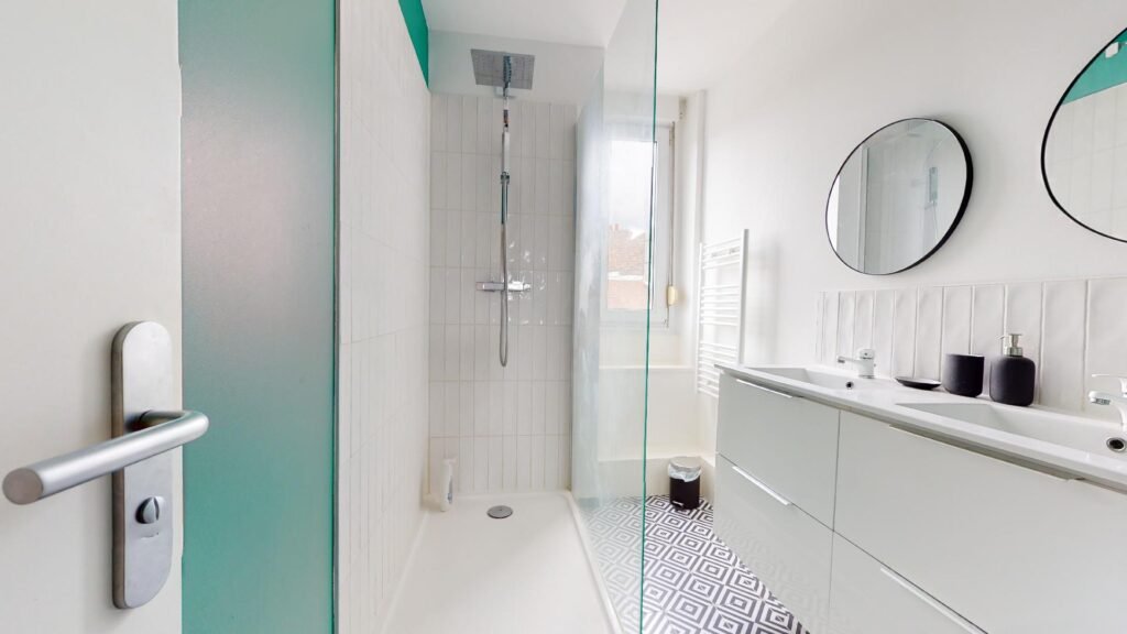 Chaque étage se compose de deux chambres, d’une salle d’eau, et d’un WC. Les trois salles d’eau du logement sont communes et se munissent d’une douche, d’un sèche-serviette et d’un double meuble vasque. Deux salles d’eau comprennent une machine à laver chacun.