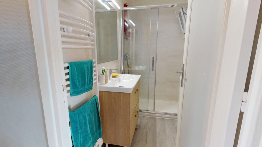 Cette chambre est équipée d’un bureau, d’un lit double, d’un miroir et d’une penderie. Cette chambre est lumineuse grâce à une grande fenêtre.