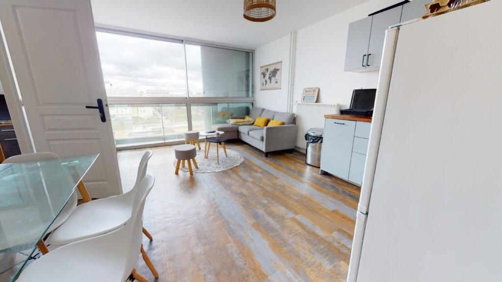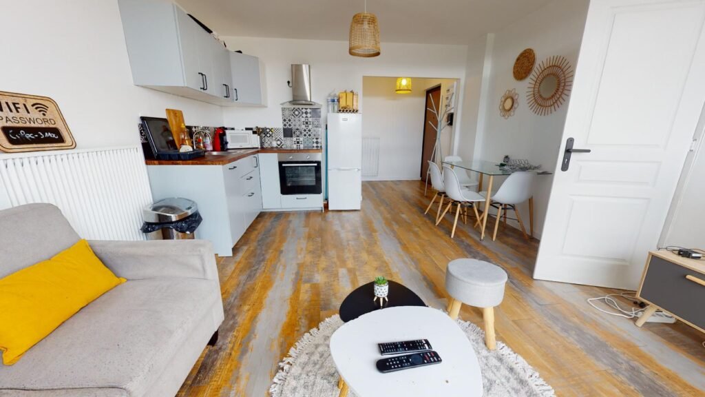 La porte d’entrée de ce logement s’ouvre sur une grande pièce de vie lumineuse aménagé avec un canapé d’angle, des tables basse, une TV et une table à manger et un espace cuisine. La cuisine ouverte sur le salon est équipée d’un frigo, d’un four, de plaques de cuisson, d’une hotte, de rangements, lave vaisselle encastré, etc.