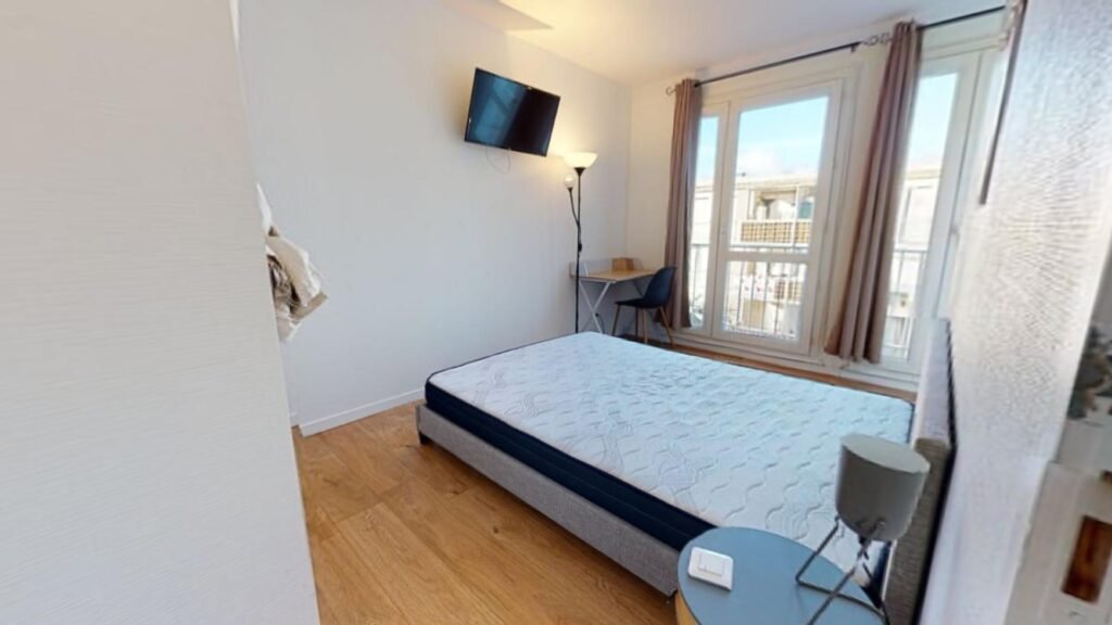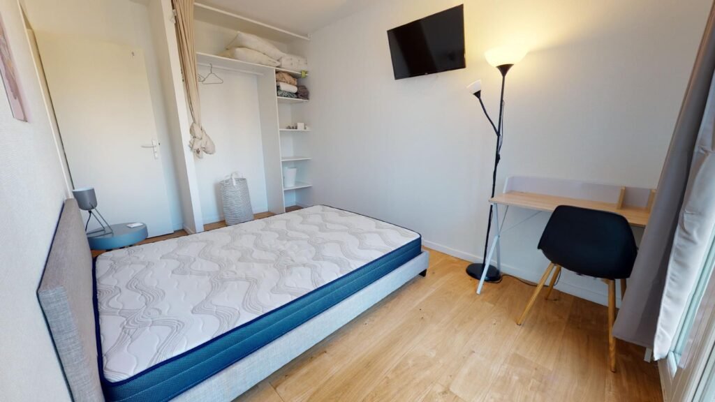 La chambre 1 de 11,5m2 est très lumineuse et offre tout le confort nécessaire avec son lit double, son bureau, sa chaise, ses rangements et sa TV privative.