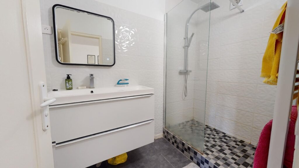 Une salle de bain avec une grande douche et meuble vasque ainsi que des WC séparés viennent compléter ce logement.