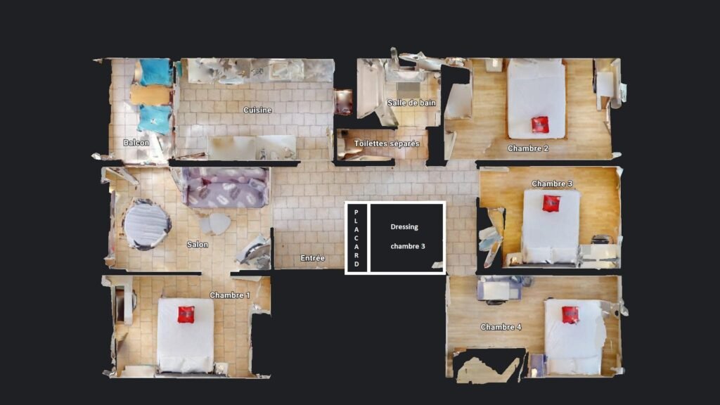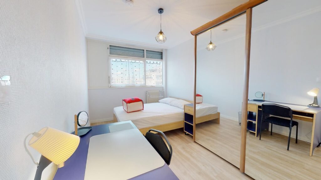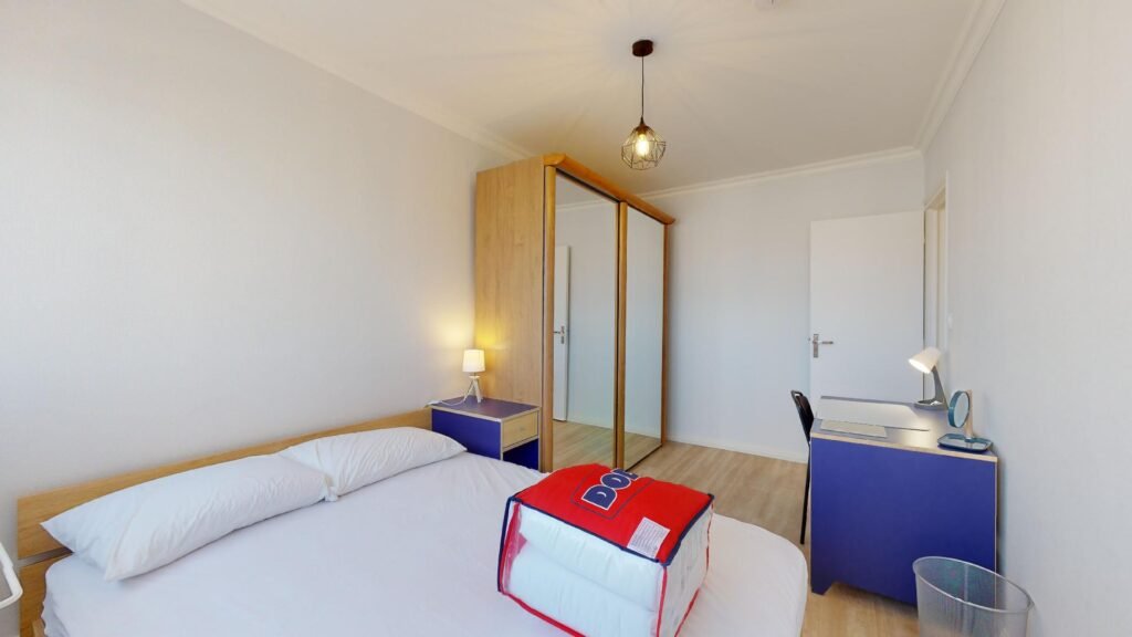 La dernière chambre de cette colocation est équipée par : un lit double, un bureau, une chambre et un placard de rangement