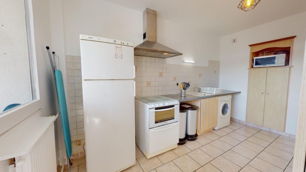 La cuisine est entièrement équipée par deux fours dont un micro onde, d’un lave vaisselle, des plaques de cuisson, une machine à laver, un frigo, une machine à café, bouilloire et un grille pain.