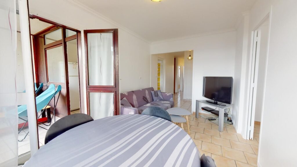 Le logement comporte un salon équipé d’un canapé, d’un meuble TV et d’une TV ainsi que de chaises et d’une table.