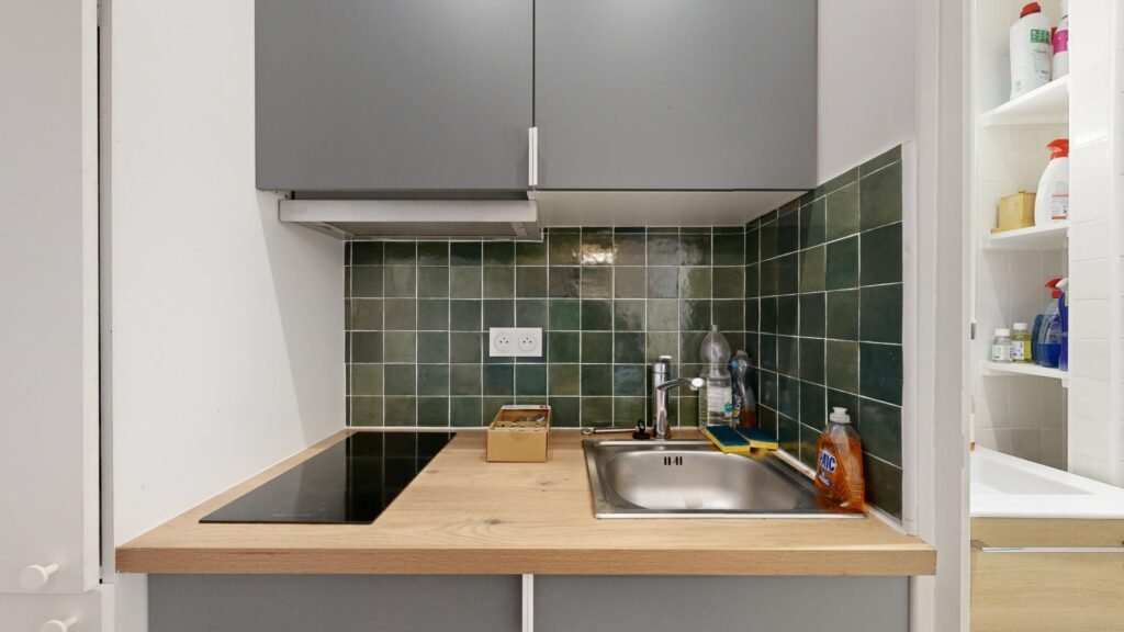 La cuisine est équipée d’un micro-ondes, de plaques de cuisson avec une hotte, d’une machine à laver, d’un évier et de nombreux rangements.