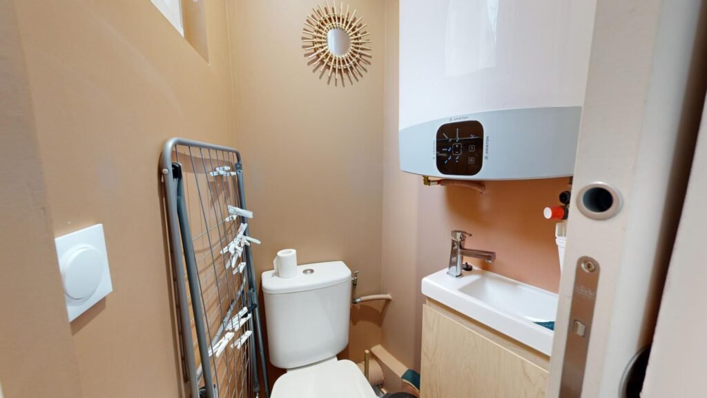 La salle d’eau dispose d’une cabine de douche, d’un porte-serviettes radiateur ainsi que d’un meuble vasque avec un miroir.