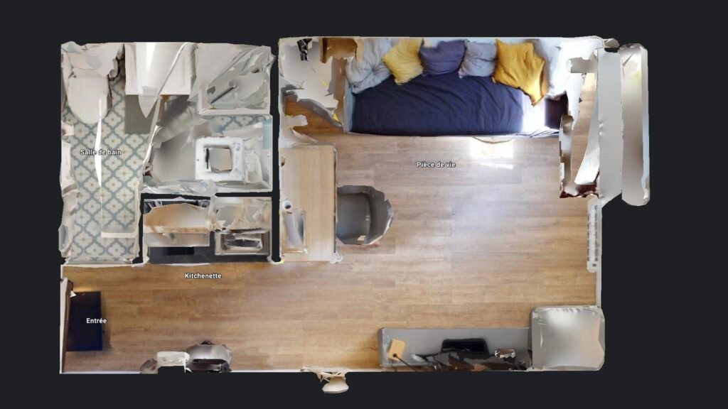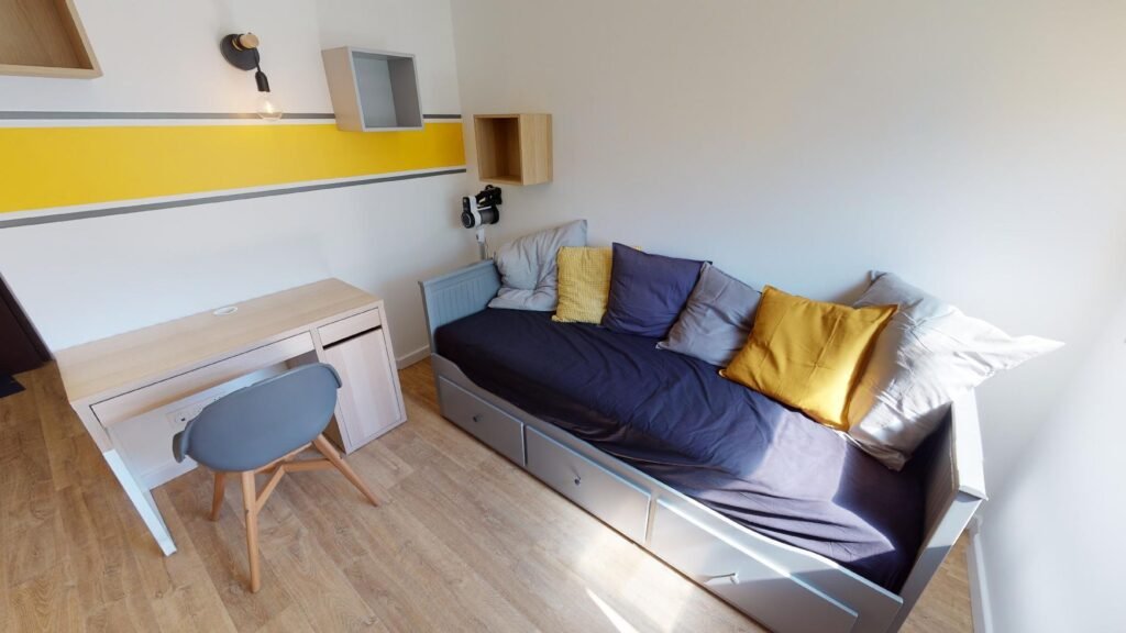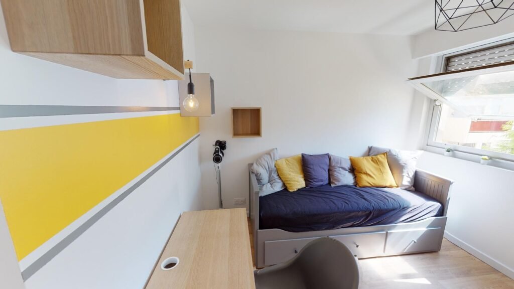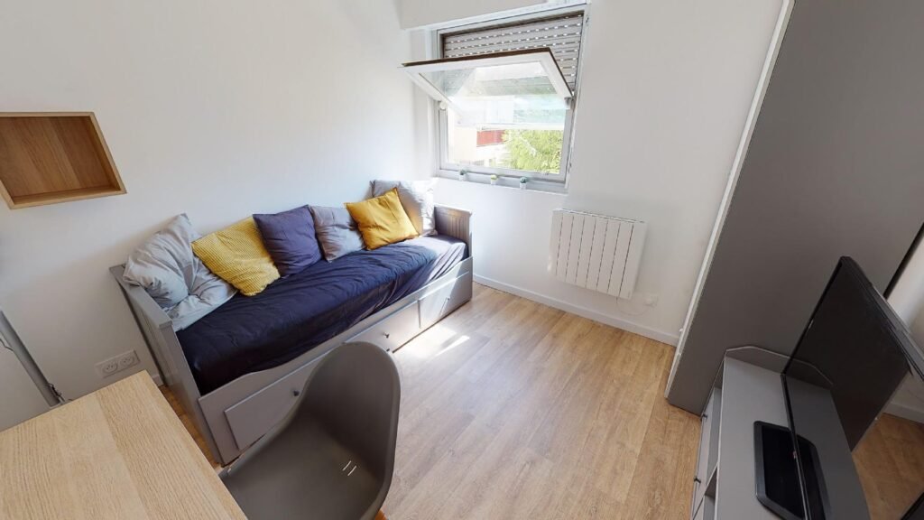 La pièce de vie de ce logement quant à elle se compose d’un canapé convertible en lit double, d’un bureau, d’une chaise, d’une TV et d’un placard de rangement.