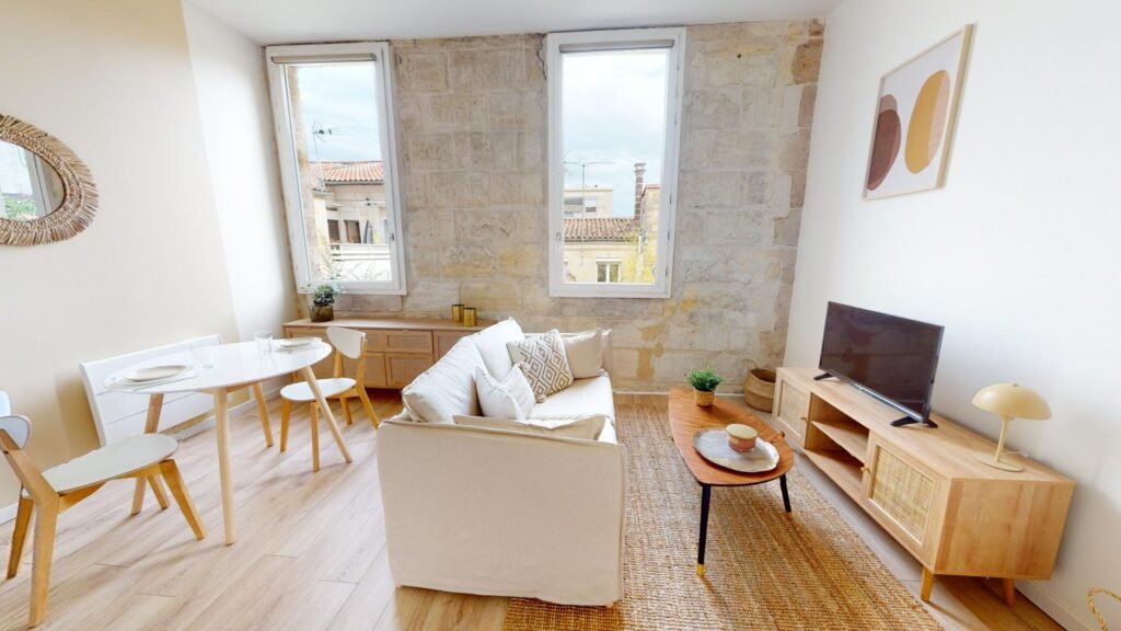 📺 Vous trouverez un salon équipé d’un canapé, d’un meuble TV avec un écran plat, d’une table basse et d’éléments décoratifs.