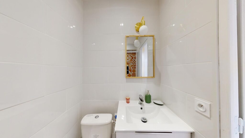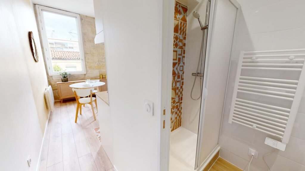 💦 La salle de bain est composée d’une douche, une vasque et d’un sèche serviette.