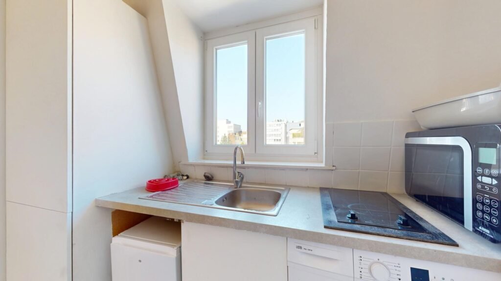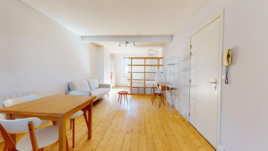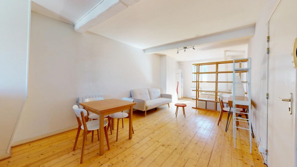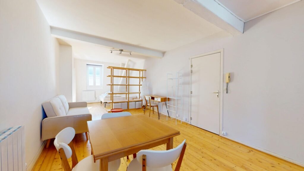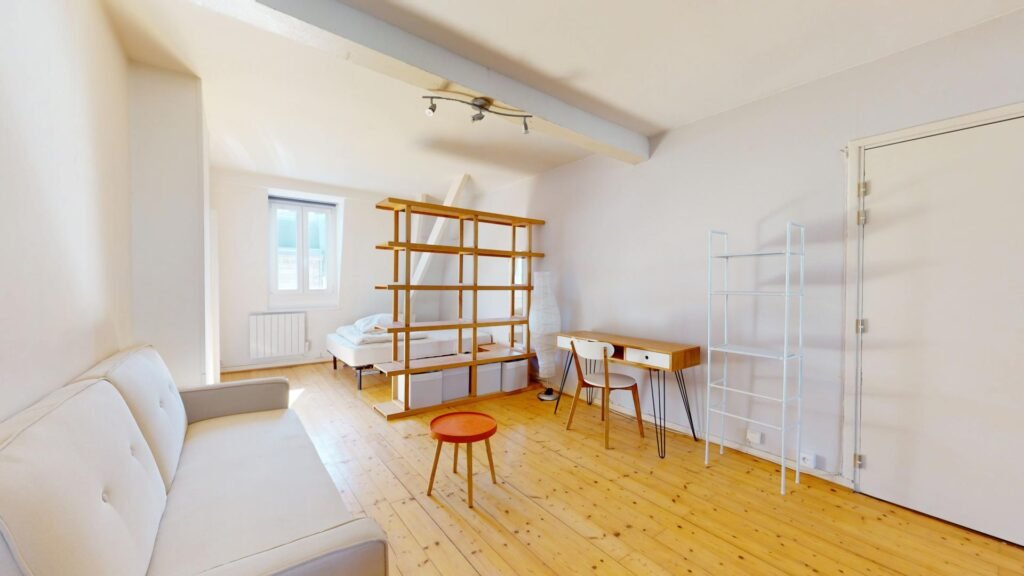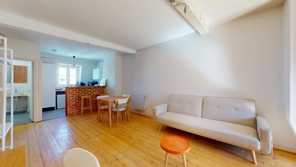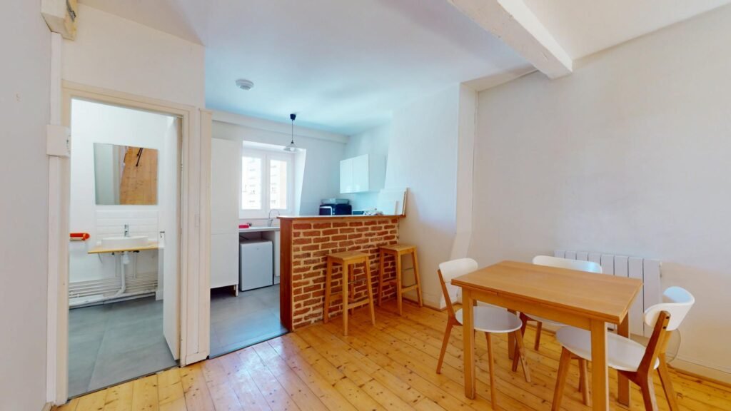 Ce joli T1, situé au troisième étage, s’ouvre sur une pièce de vie chaleureuse, meublée avec un canapé, une petite table basse, un bureau et une chaise. Une table à manger pouvant accueillir quatre personnes est également présente pour vos repas ou moments conviviaux. Un aspirateur est également fourni.