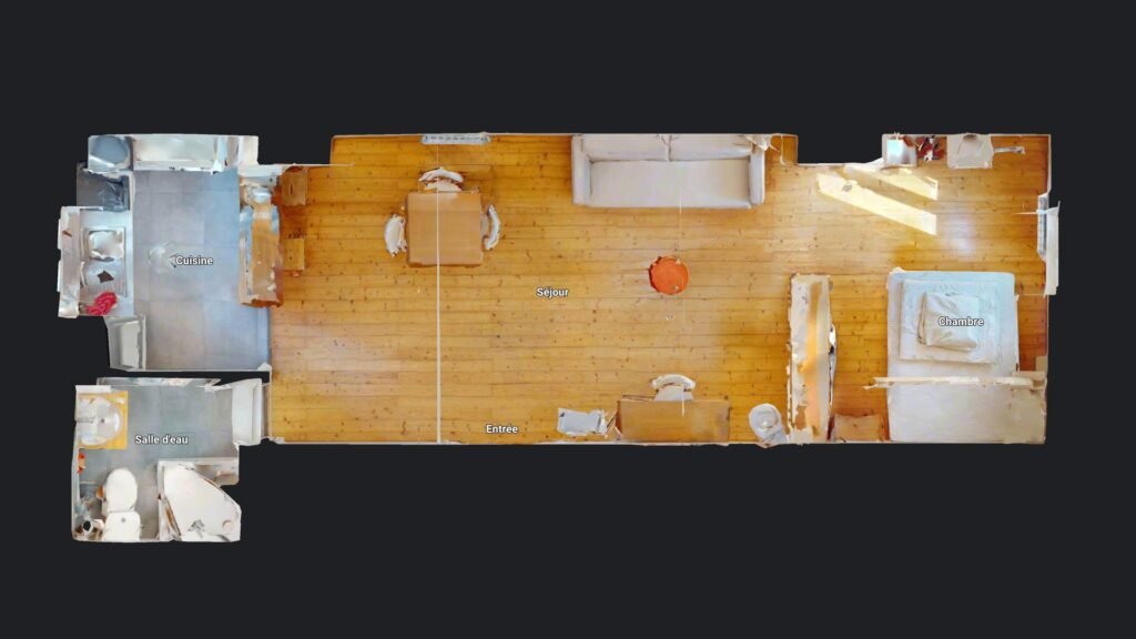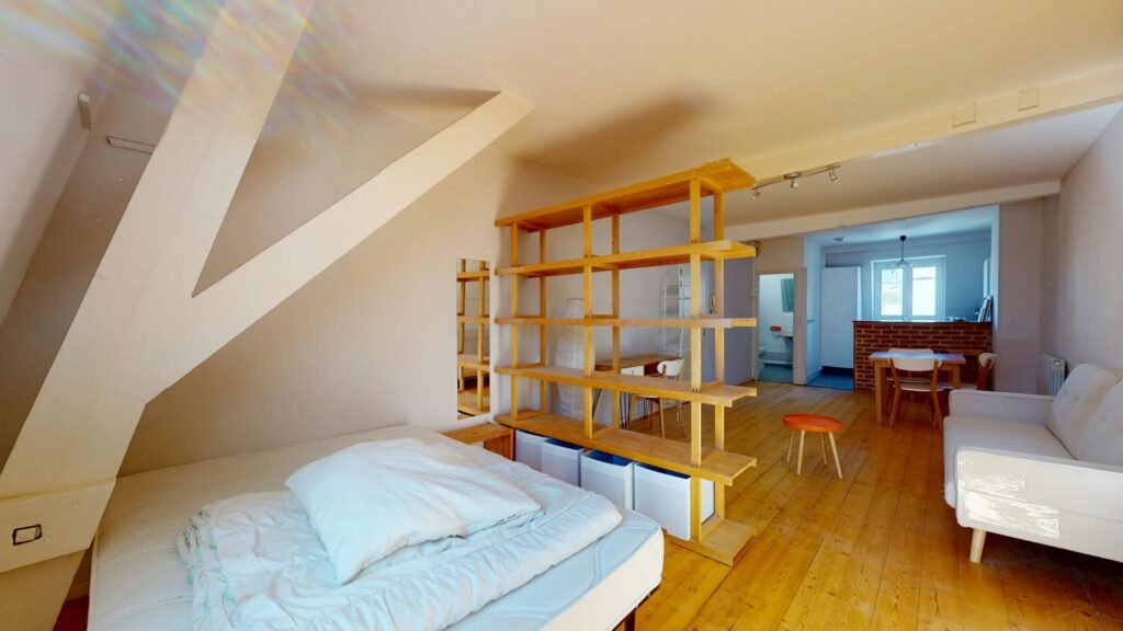 L’espace chambre se situe au fond du salon et est partiellement séparé par un grand meuble, offrant davantage d’intimité. Il est composé d’un lit double, d’une table de chevet et de nombreux rangements pour faciliter l’aménagement.