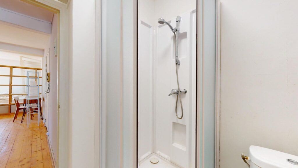 La salle d’eau comprend une douche, un meuble vasque avec miroir, un sèche-serviette, ainsi que des WC intégrés.