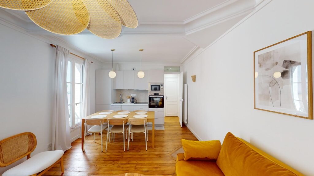 Ce superbe T2 s’ouvre sur une pièce de vie spacieuse et lumineuse, aménagée d’un canapé, d’une table basse, d’un meuble TV avec une télévision, d’un fauteuil ainsi que d’une table avec six chaises.