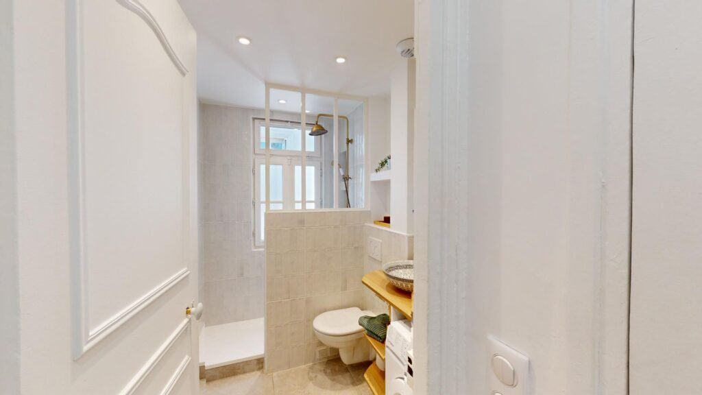 La salle d’eau se compose d’une grande douche, d’une machine à laver, d’un meuble vasque avec un miroir ainsi que d’un WC.