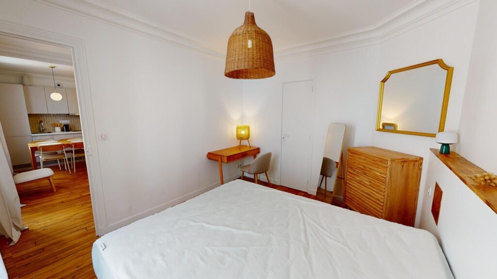 La chambre dispose d’un lit double, d’un meuble de rangements, d’un placard mural et d’un bureau avec une lampe et une chaise.