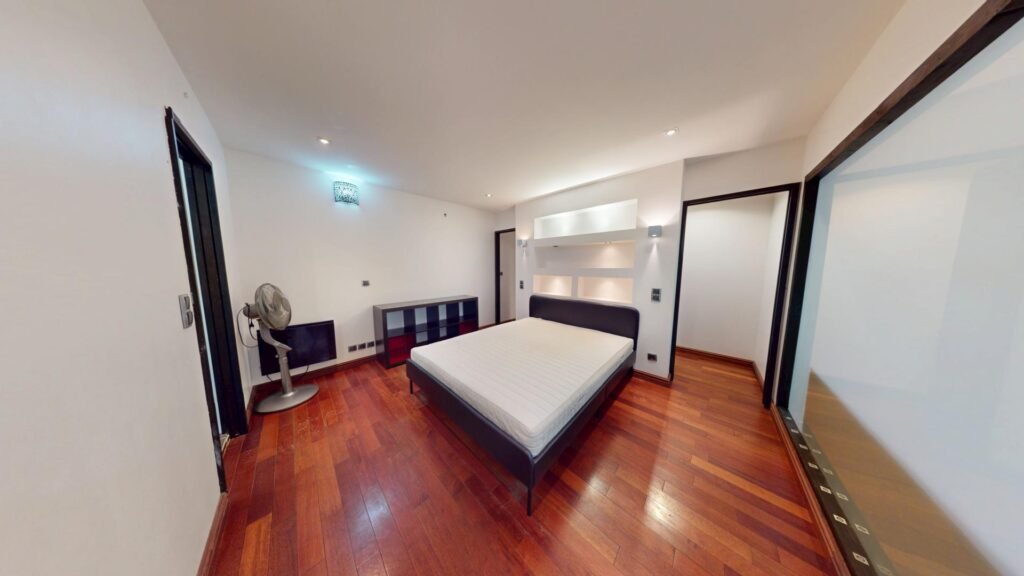 La chambre est équipée d’un lit double et de nombreux placards de rangement. Un grand dressing bien agencé vient compléter cet espace, offrant un maximum de rangement.