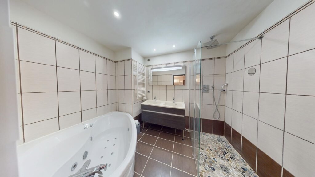 La salle d’eau, attenante à la chambre, forme une véritable suite parentale. Vous y trouverez une baignoire avec des fonctionnalités jacuzzi, une double vasque avec miroir, un sèche-serviette et des rangements pratiques. Les WC sont séparés pour plus de confort.