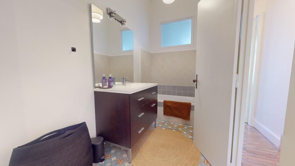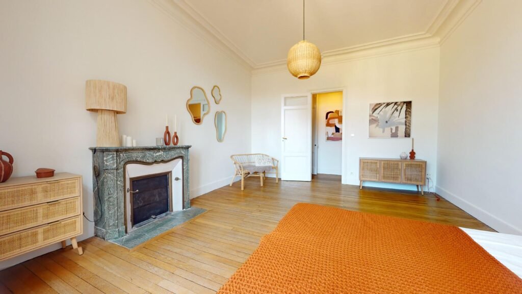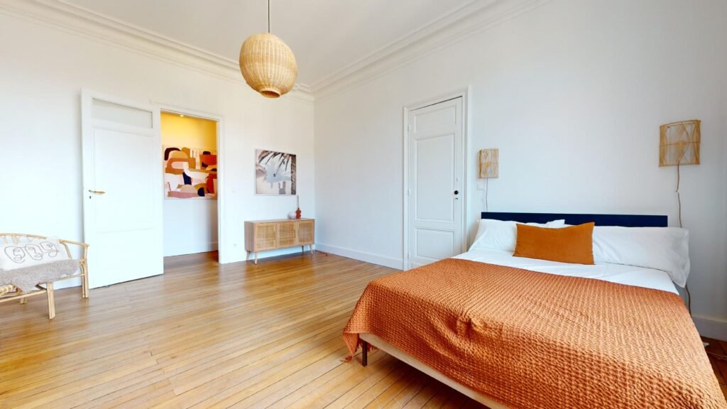 La cuisine est très bien équipée (four, plaques de cuisson, hotte, micro-ondes, lave-vaisselle, placards de rangement, etc.) et s’accompagne d’une table munie de deux chaises et d’un banc. Accolé à cette pièce, le salon est spacieux, lumineux et s’accompagne d’un canapé, d’un ensemble de fauteuils, ainsi que de plusieurs tables basses. De nombreux objets viennent parfaire la décoration, apportant beaucoup de charme au logement. La salle de bain dispose d’un meuble vasque, d’une baignoire, d’un WC et d’une machine à laver. Cet appartement dispose aussi d’une première chambre avec un meuble penderie, d’un canapé convertible et d’un bureau accompagné d’une lampe. Enfin, la seconde chambre aux allures de suite dispose d’un lit double, de lampes murales de chevet, et de plusieurs meubles de rangement.