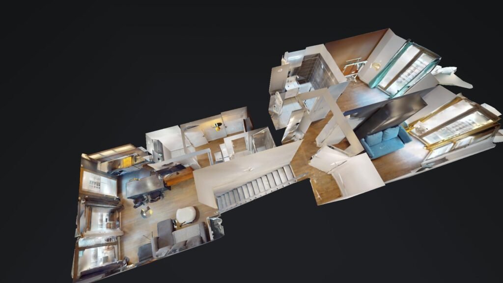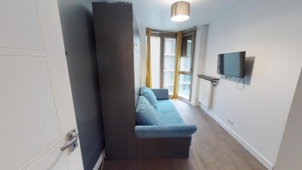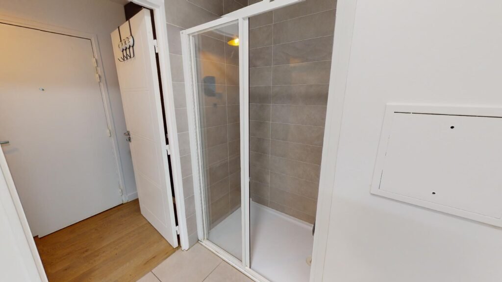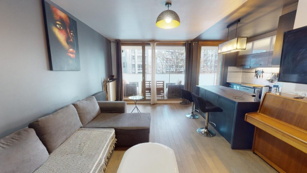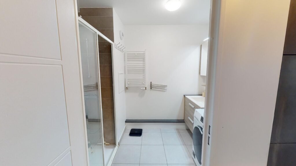 Le premier est composé d’une salle de douche moderne et spacieuse dotée d’un meuble de vasque, de nombreux rangements, d’un porte-serviette chauffant et accueille un lave-linge. Le salon lumineux par son ouverture avec des portes fenêtres coulissantes sur un balcon aménagé est composé d’un grand canapé, d’une table de salon, d’une chaise de salon, d’une petite table de lecture, d’une grande télévision, d’un piano et de rangements. Le tout est décoré avec goût.