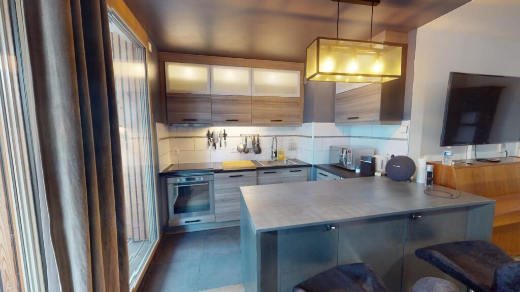Le salon donne sur une cuisine à l’américaine avec deux chaises hautes. Elle est composée d’un équipement électroménager complet (four, plaque de cuisson, réfrigérateur, lave-vaisselle, etc).