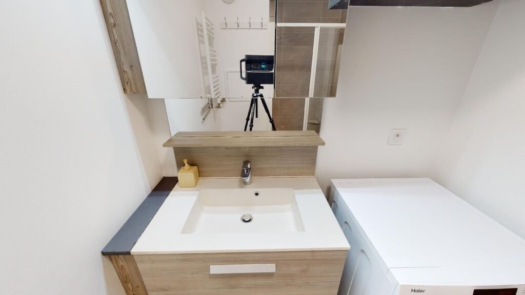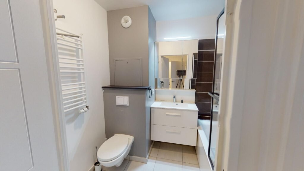 Une seconde salle de bain avec des WC se trouve à cet étage. Elle est moderne, équipée de rangements et d’un meuble vasque et possède également un porte serviette chauffant.